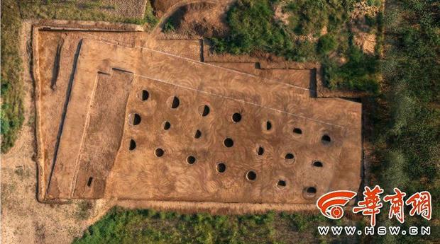 经过对比排除,考古专家发现,只有作为昭襄王的生母——宣太后使用这一葬制自然不为过。而且,宣太后在历史上影响巨大,使用国君葬制也是理所当然,之前在西安发现,秦夏太后也采用亚字形大墓安葬。孙伟刚说,他们认为,秦东陵4号陵园从年代和礼制要求来讲,所葬者当为宣太后。图为俯拍的陪葬墓,密集地分布着3排21个大小相同的神秘圆坑。 陈团结 摄 图片来源:华商网