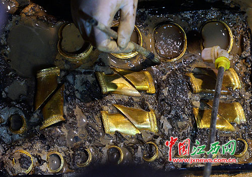 江西省文物考古研究所所长徐长青告诉小记,椁室西侧的木板下刚发现了2枚金饼,现在,数十枚马蹄金、加上两盒金饼(189枚),这210多件金器,又破了一个纪录——这是目前全国汉墓考古史中保存最完整、数量最多的一次发现。