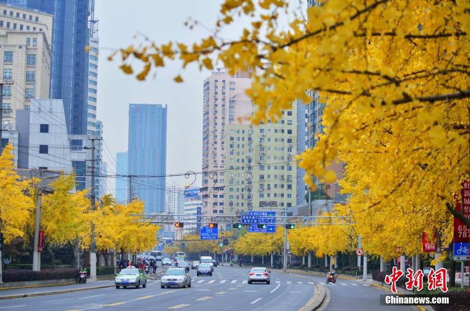 12月5日,上海,上海虹口区现最长“金光大道”。四平路上从海伦路到五角场广场一段栽满了高大的银杏树,全长超过5公里,秋末冬初,树叶逐渐变成金黄色,形成一条巨长的“金光大道”。 图片来源:视觉中国