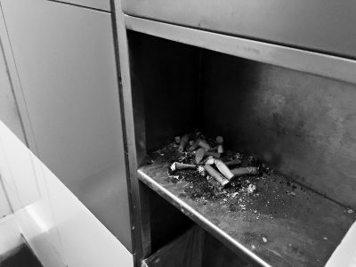 记者在其中一个马桶间的手纸篓里发现,金属板上面有几十个烟头,板上积满了烟灰,在地上也有几个烟头,这个手纸篓被烟民当成了烟灰缸。