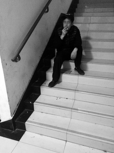 记者来到二楼,有一名身穿黑衣服的男子推门进入楼梯间,点上烟旁若无人地吸起来,吸了几口后,坐在了台阶上的一张报纸上。连续吸了两根烟后,该男子才很满足地离开。
