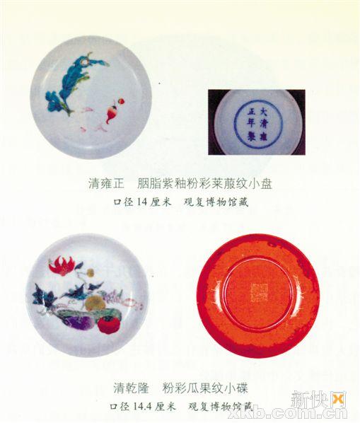 上面是雍正时期的胭脂紫釉粉彩莱菔纹小盘,它的背面是胭脂紫色,非常漂亮,署“大清雍正年制”款。正面画得非常淡雅,画了一个萝卜、一个小辣椒。下 面一件是乾隆粉彩瓜果纹小碟,上面的东西大家都很熟悉,有紫色的茄子,还有西红柿、黄瓜。背面是珊瑚红色,还带有一点描金,署“大清乾隆年制”。当时皇家 出于什么考虑做这样的瓷器呢?是出于关心民生。中国历史上凡是老百姓生活很好的时候,皇家都是提倡关注民生的。而社会发生动荡的时候就没有精力再去关心民 生的事情了。今天也是这样,就像“菜篮子工程”,过去没有提过,那今天为什么有菜篮子工程呢?是因为人口急剧地向城市聚集,城市对蔬菜的需求量急剧增加, 蔬菜就变成了一件大事。