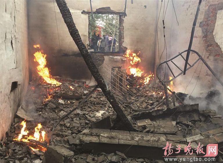 记者赶往现场时,只见远处天空上飘出黑烟。由于乡村道路狭窄,消防官兵下车跑步进入火场,迅速组织扑救。记者在现场看到,大火已经将一间出租屋房顶烧塌,紧紧相邻的一间还在燃烧。消防战士用高压水枪从窗户朝房屋里扑救燃烧的火。消防战士在出租屋里搬出一只液化气钢瓶,大火已经将阀门烧坏,液化气嗤嗤地朝外喷气。为了安全起见,消防战士将液化气钢瓶扔进门口的小水塘里。在西边出租屋里,消防战士又搬出一只液化气钢瓶。记者了解到,凶猛的火势已经将2间房屋里面的生活用品包括存折全部烧毁。