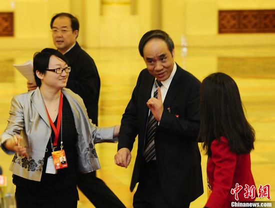 资料图:第十二届全国人民代表大会第一次会议在北京人民大会堂开幕。民建中央副主席辜胜阻(中)进入会场时,被记者“拦截”采访。中新社发 侯宇 摄