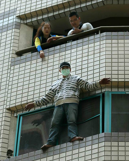 12月6日,台湾高雄,1名在市场卖鱼、住在高雄鼓山区文忠路的40岁吴姓男子因找不到女友一时想不开,站在在租屋大楼6楼外墙安全挂钩,扬言跳楼自杀。