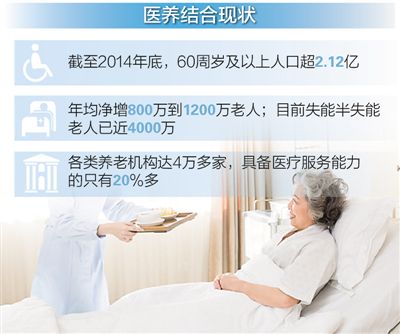 目前,我国养老需求和医疗需求快速增长。民政部有关负责人12月7日就贯彻落实《关于推进医疗卫生与养老服务相结合的指导意见》(以下简称《意见》)答记者问时表示,养老是我国当下亟待破解的重大社会问题,而医养脱节的传统养老模式是制约养老服务业有序健康发展的一大障碍。统计显示,截至2014年底,我国60周岁及以上人口超过2.12亿,占总人口的比重达到15.5%,随着人口老龄化的加剧,养老问题、老年人就医问题日益凸显。