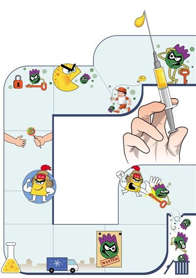 疫苗中的抗原物质随着这一小小的针管进入到体内。由于EV71疫苗保留了原来病毒的抗原特性,人体免疫系统会认为这就是病毒,从而发动自卫反击战,在抗原逐步被清除的过程中,体内也会产生出大量的EV71抗体。接种疫苗就好比人体发布通缉令告知免疫系统罪犯的模样,并让免疫系统学会了捉拿罪犯的全套本领。