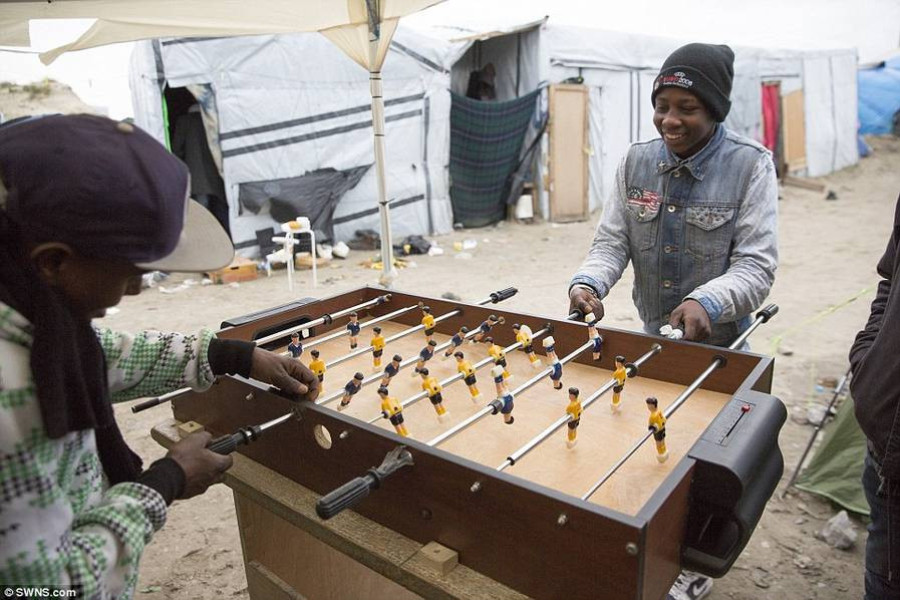预计有4500人生活在森林中。在这里的一角,有大约50座蓝色的帐篷,外表干净,秩序井然,排成整齐的6排――这是法国政府期望改变这里情况的一种努力。图为难民在玩桌上足球。