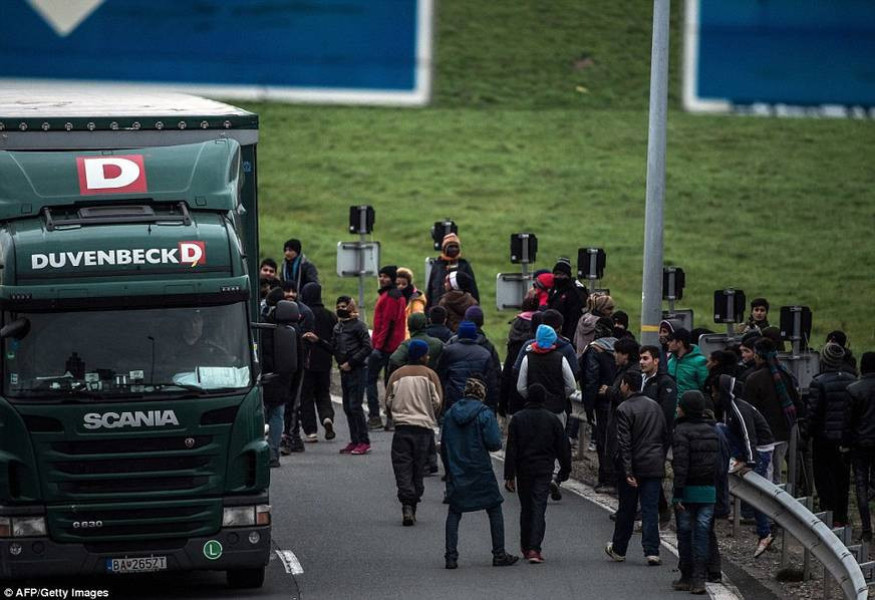 难民们组团,被人贩子团体和左翼激进分子带领前往道路,截停前往英国的卡车与轿车,期望把他们自己带上车去英国。根据附近工厂的保安说,这是一场“游击战”。冲突中警方会被投掷石块。图为难民们试图扒车去英国。