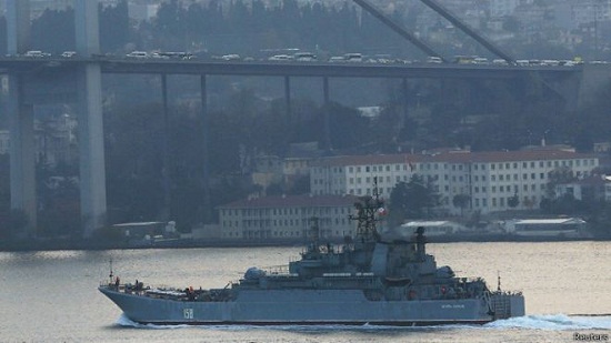 土耳其媒体公布的照片显示,俄罗斯大型登陆舰“凯撒库尼科夫”号12月5日驶过博斯普鲁斯海峡时,甲板上有士兵肩扛火箭发射器。