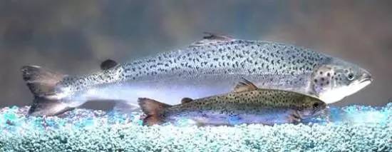 图中大鱼为转基因三文鱼,小鱼为野生三文鱼。