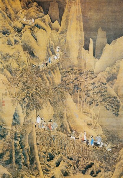 大抵四十年前,笔者寄居陕南汉中褒城对岸河东店,乃史上往来秦蜀古褒斜道起点,溯褒河北上时见循谷缘崖峭壁间遗留累累栈孔遗迹。遥想发生在此蜀道上 明修暗渡、南征北伐真实故事,直让吾感及唐刘禹锡“人世几回伤往事,山形依旧枕寒流”和陆放翁“古来历历兴亡处,举目山川尚如故”诗句而发思古之幽情…… 许是这番恋“栈”情结使然,多年后观摩仇英描绘蜀栈行旅高头大轴《剑阁图》,笔者又联想起的是同属“明四家”唐寅“栈道连云势欲倾,征人其奈旅魂惊”的 《题栈道图》诗;同时未免生出这般观点:若道古之雅好书画者惯于航行旅途卧游随身书画遂有“书画船”说的话;则喜爱蜀道景致丹青手辈,该亦有“书画栈”说 的吧。因为自唐“大小李将军”李思训、昭道父子《明皇幸蜀图》,到“画圣”吴道子嘉陵山水图,以及宋徽宗《宣和画谱》著录“南宗”山水画鼻祖唐王维《剑阁 图》、《蜀道图》以降,蜀栈山水画作简直指不胜屈,画家代不乏人啊。仇英《剑阁图》就堪称该题材佳构且不止仅此一幅。明《汪氏珊瑚网名画题跋》间文嘉《仇 实父云栈图》曰:王右丞(王维)《剑阁图》,余尝见叔明(“元四家”王蒙)临本,乃方尺小幅,石田先生(“明四家”沈周)广而为二图,余皆曾摹,今俱不能 记矣。偶见实父此幅,不觉有似人之喜,因题其上。