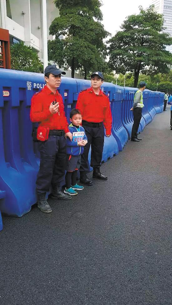 事情的经过是这样的:12月6日上午大概9点左右,参加了迷你马拉松的“拍好广州”公益组织的负责人沈敦文在距离终点还有几百米的时候,发现旁边有一个六七岁的小男孩站在路边,胸口挂着参赛牌,旁边还站着两个身穿红色制服的广东省辅助救援队的工作人员(见上图,沈敦文摄)。当时沈敦文用手机拍了一张照片,放上了新浪微博:“广马开跑~家长先跑了,把小盆友落下了?!?/p>