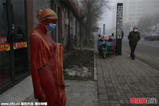 近日,北京空气污染持续加重,部分监测站点PM2.5接近爆表,北京宋庄艺术家们给艺术区里的雕塑戴上了口罩?;颐擅傻目掌锴忱渡目谡址浅P涯?。