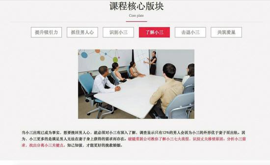 根据该公司提供的婚姻关系方面的教学视频,课程涉及话题众多,比如“要爱上自己的性别”、“女人真正想要的是什么”、“为什么在一起,为什么分开”,话题基本围绕婚姻状况,不乏犀利观点。