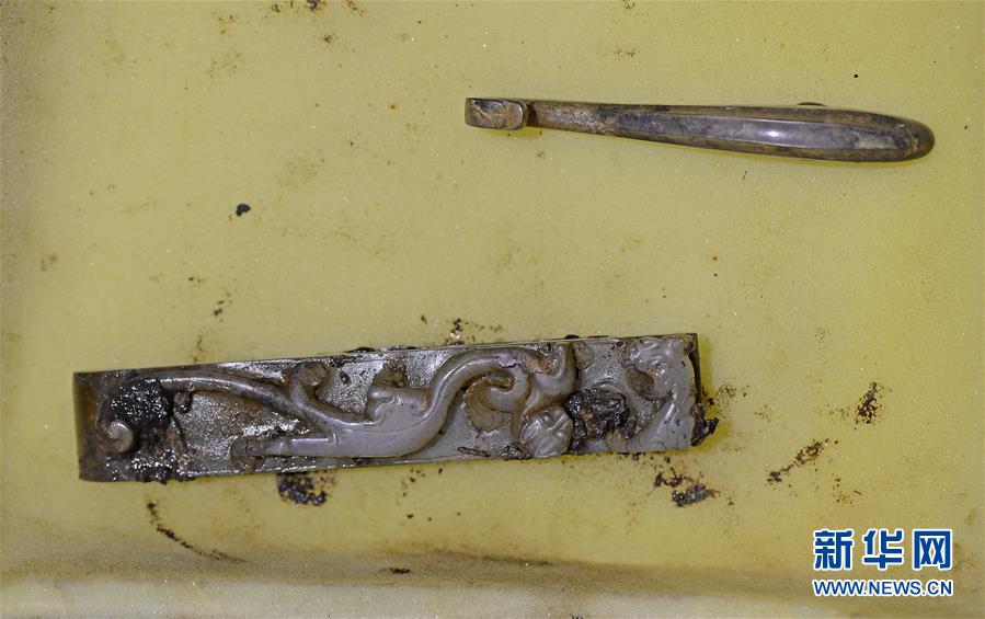 这是?;韬钅挂胖烦鐾恋挠窠>撸?2月7日摄)。 12月7日,考古工作者在南昌西汉海昏侯墓主椁室东南侧发现多件玉器,其中包括玉耳杯、鸡心形玉佩、玉环等。据专家介绍,此次出土的玉器做工精美,表明了墓主人身份和地位的高贵。新华社记者 万象 摄