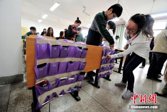 资料图:学生们自愿将手机放入贴有自己姓名的手机收纳袋中。图片来源:CFP视觉中国
