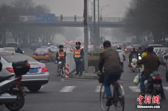 12月9日,北京市处于六级严重污染级别。图为交通协管员在雾霾中坚守岗位。 中新网记者 金硕 摄