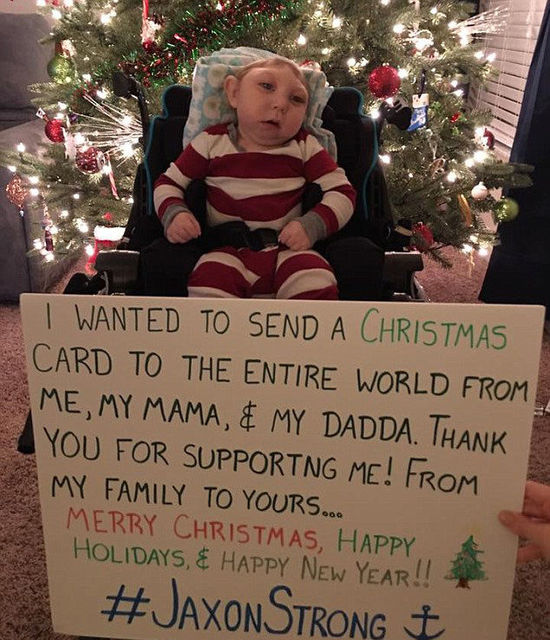 日前,杰克森的父母在网上上传了一组感人的照片。照片中杰克森坐在一棵圣诞树前,他前面立着一块纸板,上面是杰克森一家给长期以来支持杰克森的人的感谢信。