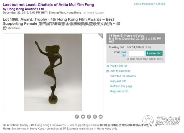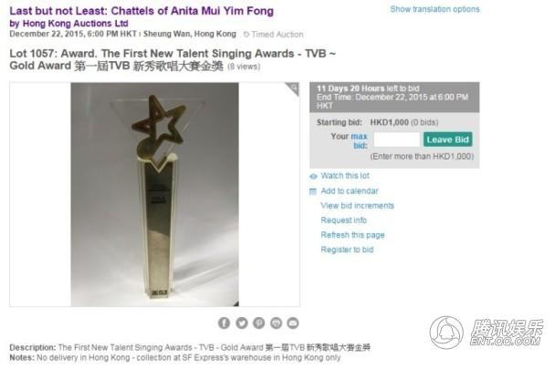 据悉,由梅艳芳小姐遗产管理人汇丰信托(香港)有限公司主办的《Last but not Least—最后芳华》梅艳芳个人物品网上拍卖会,将于香港时间2015年12月10日下午6时至12月22日举行,将有合共3000多件梅艳芳个人物品在网上拍卖,亦是梅艳芳个人物品的最后一次拍卖会。拍品包括梅艳芳的个人服饰、手袋、鞋履、珠宝、唱片、相片、内衣等,起步价100港币(约合人民币83.05元)至10000港元(约合人民币8305元)不等。