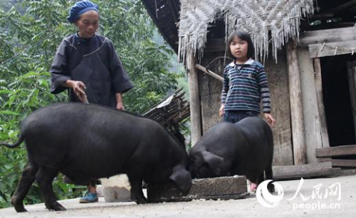 贵州省罗甸县打改村,一位老人带着孙女喂猪。人民网 赵艳红摄