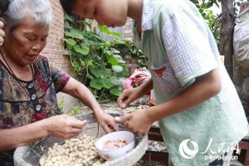 河南省西华县东高村,肖楠(化名)帮奶奶剥花生。他的爸爸妈妈在新疆打工。人民网 宋芳鑫摄