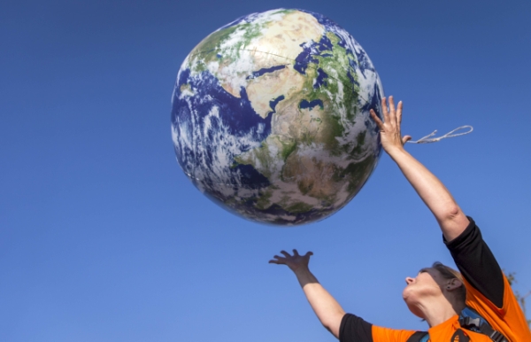 这是2015年10月10日,在荷兰阿姆斯特丹,一名女子放飞一个地球造型的气球,抗议“跨大西洋贸易和投资伙伴关系协定”。新华社/法新(高静编辑)