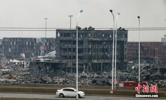 资料图:天津滨海新区爆炸事故现场一片狼藉,现场的楼房被爆炸燃烧得面目全非。 中新社发 张浩 摄