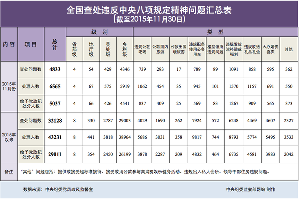中新网12月17日电 据中央纪委监察部网站消息,2015年11月全国查处违反中央八项规定精神问题4833起。其中涉及省部级4人,均受到党政纪处分。