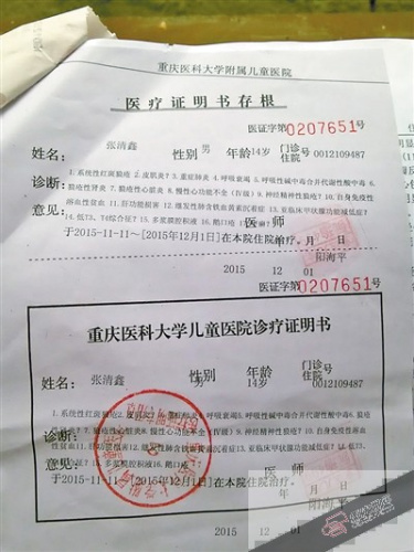 经过胸穿、腰穿、肿瘤等一系列的检查后,儿童医院给出了最后的结果:张清鑫患系统性红斑狼疮、皮肌炎、重症肺炎、呼吸衰竭、肝功能损伤等16种疾病。