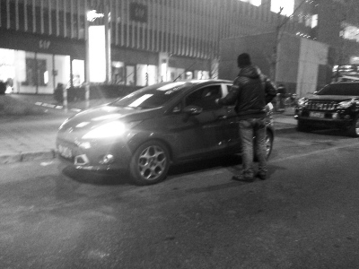 晚上6点多钟,记者来到太阳宫南街和太阳宫中路的十字路口,在凯德 mall商场的东侧辅路边,停靠着几十辆汽车,在辅路的绿化带边,坐着一名头戴黑帽子的中等身材年轻男子,上身穿一件黑色羽绒服,两手插在上衣兜里左顾右盼,身边放着一个水杯。有一辆白色汽车开过来,男子马上站起来迎过去,向车辆示意停到路边,白色汽车闪了两下大灯,从他身边开了过去,他又坐回到路边的台阶上。