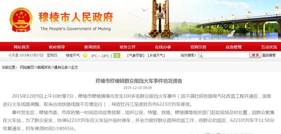 黑龙江穆棱市政府发布通告,9日上午,当地发生100多名群众阻挡火车事件,牡丹江至虎林方向6223次列车停滞近2个小时。通报称,事发因民众不满牡绥铁路电气化改造工程开通后,国家调整火车线路,取消当地铁路线路,造成出行不便。