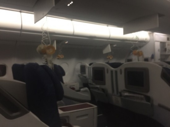 据现场图片以及乘客在社交媒体上发布的信息显示,机上氧气面罩全部脱落。据@李西西奇遇记,飞机起飞后两小时被广播惊醒,空姐惊慌不已、声音颤抖局促,广播内还不时传出其他空姐的尖叫。据现场图片以及乘客在社交媒体上发布的信息显示,机上氧气面罩全部脱落。