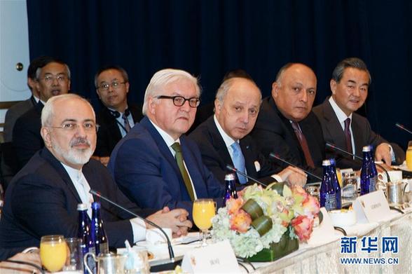 12月18日,伊朗外长扎里夫、德国外长施泰因迈尔、法国外长法比尤斯、埃及外长舒凯里和中国外长王毅(前排从左至右)在纽约参加叙利亚国际支持小组第三次外长会。当日,外交部长王毅在纽约出席叙利亚国际支持小组第三次外长会。王毅就启动和谈、停火止暴、合力反恐、人道救援和经济重建五大方面提出中方政治解决叙利亚问题的主张和建议。新华社记者李木子摄