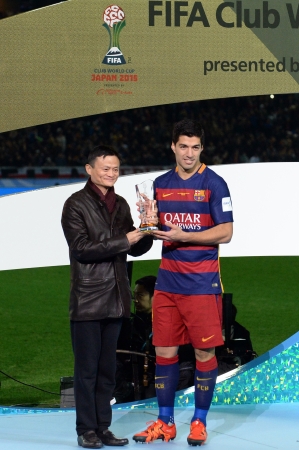 12月20日,阿里巴巴集团董事局主席马云(左)为西班牙巴塞罗那队球员苏亚雷斯颁发最有价值球员奖杯。