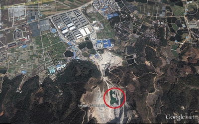 2002年,此处为采石场,山体被挖出一个山谷状深坑。