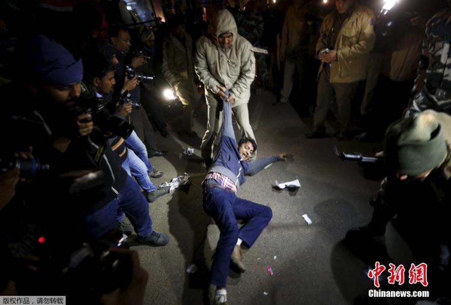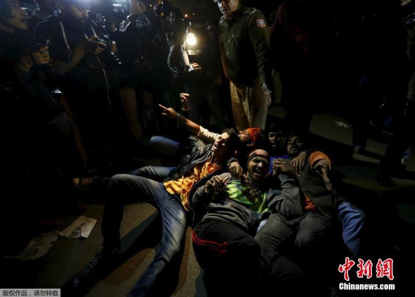 当地时间2015年12月20日,印度新德里,民众爆发抗议。印度新德里2012年“黑公交”轮奸致死案的一名罪犯日前刑满获释,在印度社会引起争议和恐慌,民众示威抗议。