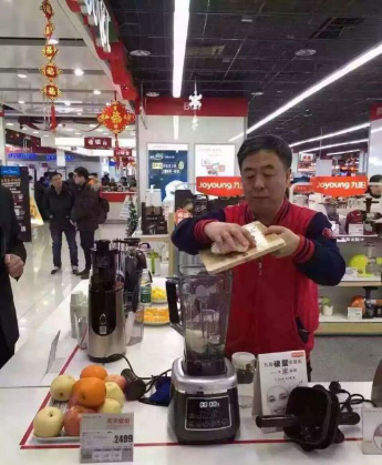 国美萌叔——总裁王俊洲给顾客现场榨果汁