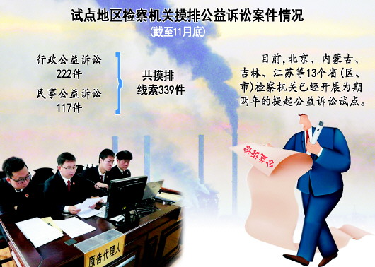 目前,北京、内蒙古、吉林、江苏等13个省(区、市)检察机关已经开展为期两年的提起公益诉讼试点。