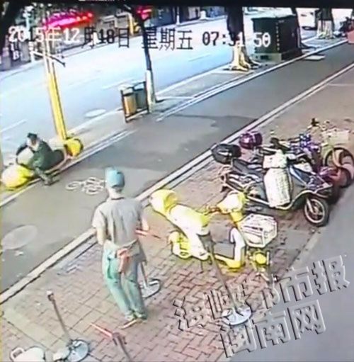 陈先生刚出店,没走两步,路过的这辆电动车突然摔倒,他赶紧过去帮忙扶起来(视频截图)
