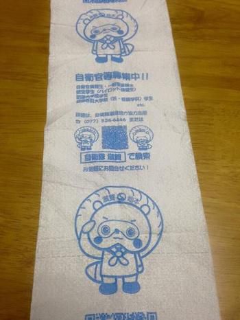据悉,这些宣传厕纸上画着一只戴军帽的卡通,并配上文字:“自卫官募集中、快上网检索、欢迎询问”等字样。