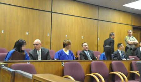 中国留学生虐待同学的首批三名嫌犯翟云瑶、章鑫磊和杨雨涵(从左至右)今年5月在法庭出庭。(美国《世界日报》资料照片)