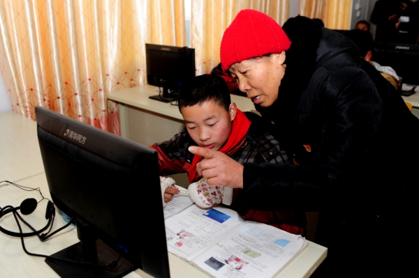 12月22日,在确山县西王楼村小学,吴树兰在刚落成不久的电教室中跟一名学生交流。 新华社发(冯大鹏 摄)