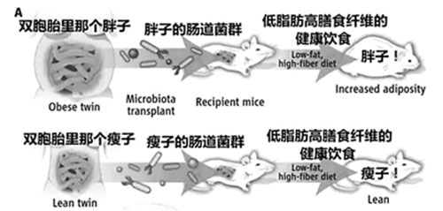 到了现代,2013年,美国华盛顿大学的Gordon教授往雷尼耶发明的无菌鼠体内安置了人的肠道菌群。注意,这个实验里的人,可不是一般的人,是双胞胎,而且不是普通的双胞胎,是一胖一瘦的双胞胎。