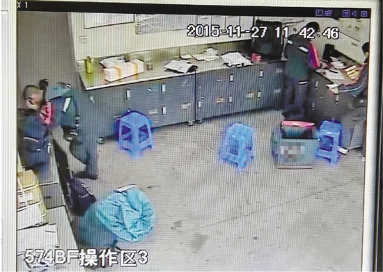 他给记者看了一段翻拍的监控:寄件当天的11点37分,快递员小罗进入网点开始整理快件,他的快递包一直放在桌上,正好挡住了手部位置,看不清手上的动作。
