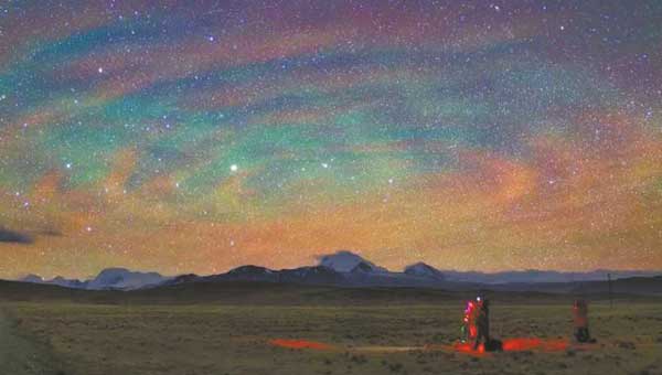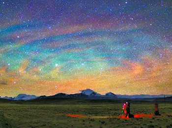 那是2014年4月的一天,第一次到西藏岗巴县的戴建峰,在这个夜晚捕捉到了喜马拉雅山脉上空的漩涡状气辉涟漪,这是源于孟加拉国上空一个强雷暴系统引起的大气重力波变化。幸运的是,来自NASA和NOAA(美国国家海洋和大气管理局)的SUOMI NPP卫星也同时记录到这一罕见天象,形成了珍贵的地面与太空同步资料。