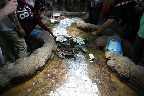 资料图片:游客把人民币贴在龟甲上
