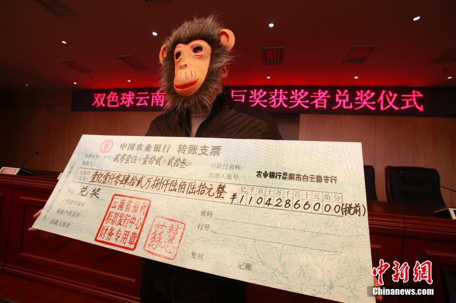 关键词:双色球得1.1亿 戴猴面具领奖