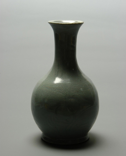 “天下名瓷,汝窑为魁?!北彼挝宕竺ぁ叭辍⒕?、官、哥、定”中,河南独占其三,且汝窑位居魁首。此汝窑天蓝釉刻花鹅颈瓶,造型秀丽,釉面光亮,器表配以若隐若现的刻花装饰,为汝窑传世品中所罕见。