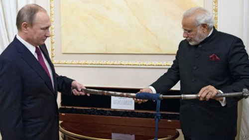 印度总理莫迪日前对俄罗斯展开为期两天的访问,图为莫迪和俄总统普京互赠礼物。